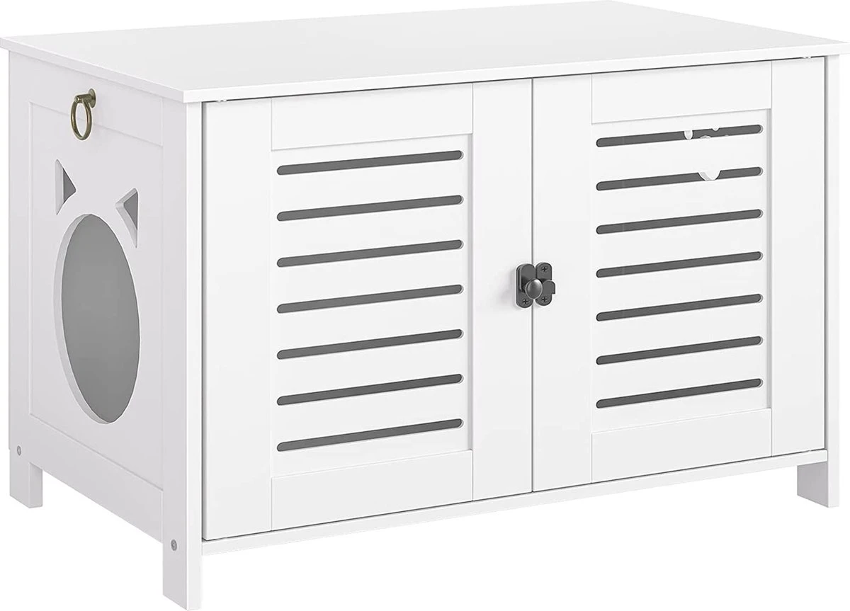 - Dubbele deurluiken: het ontwerp met dubbele deur van het kattenhuis vergemakkelijkt het openen en sluiten. Je kunt de kattenbakvulling gemakkelijk reinigen en de kattenbak eenvoudig neerzetten. Het klassieke, moderne deurdesign met luiken verhoogt de luchtdoorlatendheid, zodat je je geen zorgen hoeft te maken over een sterke geur tijdens het gebruik
