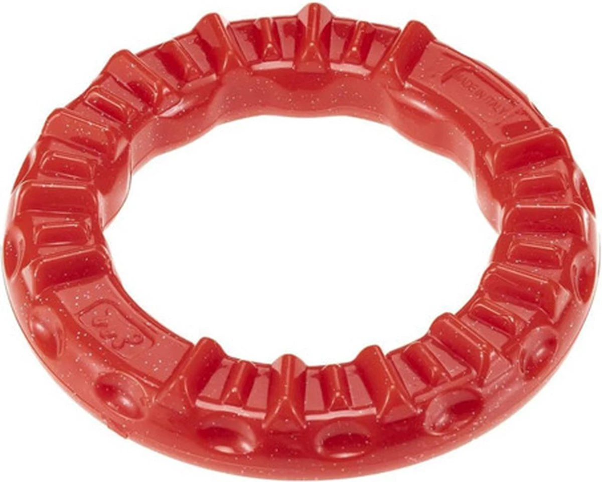 Dit Ferplast Smile hondenkauwspeeltje is voor dit doel de juiste oplossing. Naast de voeding en het regelmatig schoonmaken van de tanden met een tandenborstel, kan dit speeltje gebruikt worden om je hond te stimuleren om te kauwen. Het zal je hond bezighouden en tegelijkertijd vermaken. Door de toevoeging van bicarbonaatkristallen, bevordert deze bijtring de vermindering van tandplak en tandsteen. Zo draagt hij bij aan perfecte mondhygiëne en een frissere adem. Dankzij het onregelmatige oppervlak houdt het speeltje de spieren in de mond getraind en masseert het op een aangename wijze het tandvlees van je hond. Het kan met smakelijke brokjes worden gevuld om de interesse van je hond te wekken. Het bevordert zo spelen en plezier. Dit kauwspeeltje is perfect om mee te apporteren of om trekspelletjes mee te spelen. Dankzij de vleessmaak is het speeltje aantrekkelijk voor je viervoeter. Het Smile hondenspeeltje is gemaakt van thermoplastisch rubber. Dit is een duurzaam en niet-giftig materiaal, waardoor het veilig is voor honden.