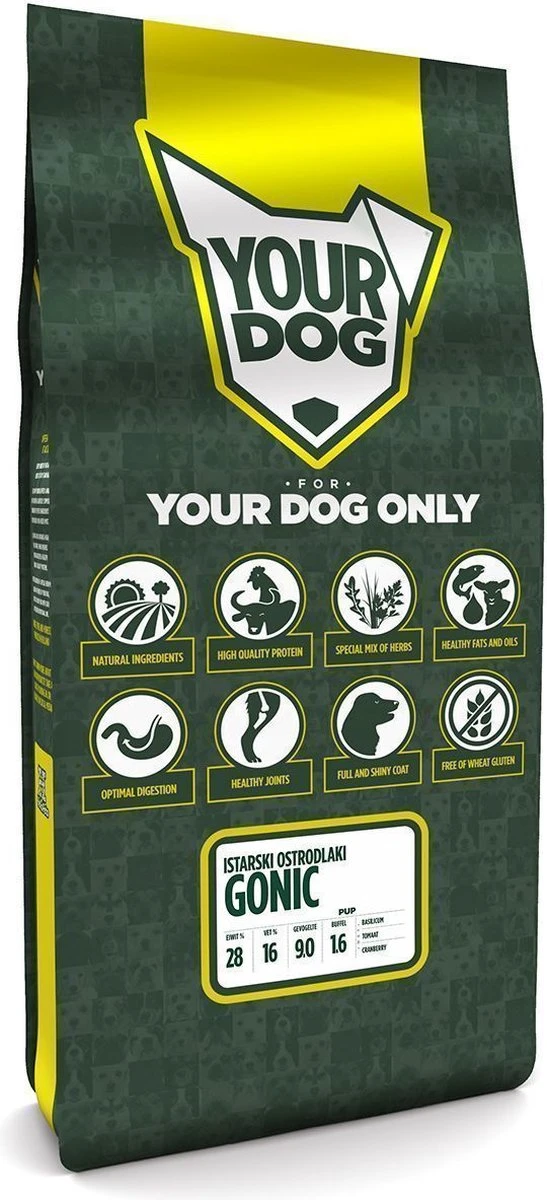 Yourdog Istarski ostrodlaki gonic Hondenvoer | Pup | 12KG, Yourdog Istarski ostrodlaki gonic zorgt voor de holistische gezondheid en het welzijn van jouw hond. Alle Yourdog varianten bevatten smaakvolle buffel en kip. Wij combineren dit met zorgvuldig geselecteerde groenten, fruit en kruiden om zo te komen tot de perfecte voeding voor jouw Istarski ostrodlaki gonic. Waarom Yourdog Istarski ostrodlaki gonic, Rijk aan buffel en gevogelte, Speciaal gemaakt voor de Istarski ostrodlaki gonic, Bevat Basilicum, Tomaat en Cranberry, Bevordert een gezonde, glanzende vacht, Behoud een gezonde darmflora, Vrij van kunstmatige geur-, kleur- of smaakstoffen, Ook geschikt voor de gevoelige Istarski ostrodlaki gonic, Onze ingrediënten, Voor het maken van ons voer wordt er voor een 12 kg-zak 10,6 kg vlees ingedroogd, zodat dit beter te verwerken is in onze brok. Met de juiste hoeveelheid groente, fruit en kruiden is Yourdog een gezonde, voedzame keuze voor de hond. Buffel, Bij Yourdog gebruiken wij vlees van vrij opgegroeide en gras gevoerde buffels. Buffelvlees staat bekend om zijn romige, frisse smaak en rijke kleur en zit vol met vitaminen en mineralen. Met een lager cholesterol- en vetgehalte en minder calorieën zit dit malse vlees bomvol gezondheidsvoordelen. Gevogelte, Bij Yourdog maken wij gebruik van eend, kip en kalkoen welke samen zorgen voor een heerlijke smaak en aroma van de brok. De hoog verteerbare eiwitten in het gevogelte zorgen voor een goede spieropbouw en zijn rijk aan vitaminen en mineralen. Groente, Om de hond te voorzien van extra waardevolle voedingsstoffen zijn supergezonde groenten aan ons voer toegevoegd. Zo zijn groenten niet alleen voedzaam, maar hebben ze ook nog andere gezonde eigenschappen. De ruwe vezel in groenten is goed voor de darmen en kan onder andere bijdragen aan de spijsvertering. Fruit, Wij voegen een unieke combinatie van fruit toe aan Yourdog, waardoor de hond alle essentiële, natuurlijke antioxidanten binnen krijgt. Zo kan fruit goed zijn voor het immuunsysteem van de hond, maar het kan ook bijdragen aan een frisse adem of het behouden van een gezonde spijsvertering. Deze natuurlijke ingrediënten bevorderen de gezondheid van de hond. Kruiden, De gezonde kruiden die ons voer verrijken zijn afkomstig van planten uit Europa. Het gebruik van onder andere kruiden, wortels, bloemen, planten en wieren vindt zijn oorsprong al duizenden jaren terug. Deze ingrediënten ondersteunen de natuurlijke processen in het lichaam van de hond, zoals de spijsvertering. Ieder ingrediënt dat wij aan ons hondenvoer toevoegen is met zorg geselecteerd vanwege de positieve eigenschappen. Afhankelijk van de grootte van de hond, het ras of de rasgroep worden ingrediënten extra onder de aandacht gebracht. Rasspecifieke klachten kunnen worden verminderd door het gebruik van kruiden, wortels, bloemen en planten. Istarski ostrodlaki gonic specifieke groente, kruiden en fruit, Wij hebben zorgvuldig de raseigenschappen van de Istarski ostrodlaki gonic onderzocht. Ook hebben we onderzoek gedaan naar de eigenschappen van de FCI-ras sectie en de FCI-rasgroep waar de Istarski ostrodlaki gonic toe behoort. Uit deze onderzoeken zijn, in overleg met vooraanstaande Nederlandse voedingsdeskundige, ingrediënten geselecteerd die de gezondheid en het welzijn van de Istarski ostrodlaki gonic optimaal ten goede komen. Basilicum, Basilicum is een geslacht uit de lipbloemenfamilie. De naam komt uit het Oudgrieks, waarin ‘basileus’ koning betekent, de alternatieve benaming is dan ook koningskruid. Het komt oorspronkelijk voor tussen centraal Afrika en zuidoost Azië. Volgens traditionele geneeswijzen werd basilicum ingezet als behandelmethode voor onder andere artritis, bronchitis, verkoudheid, maagzweren, hartziekten en buikpijn. Onderzoek heeft getoond dat basilicum sterke antioxidante, antivirale en antimicrobiële eigenschappen kan hebben. Hiernaast kan basilicum de spijsvertering bevorderen, helpt het bij de afvoer van afvalstoffen en kan het een krampstillende en kalmerende werking hebben op de hond. Tomaat, De tomaat is onderdeel van de nachtschadefamilie en is afkomstig van de tomatenplant, oorspronkelijk uit Meso-Amerika. Kleine varianten werden in Meso-Amerika gekweekt door de Azteken en de Maya’s. In 1893 werd in Amerika besloten dat de vrucht moet worden beschouwd als een groente. Bij Yourdog gebruiken wij tomaat op een culinair niveau, hierbij gaan wij uit van tomaat als groente. Tomaten zijn rijk aan voedingsstoffen, laag in calorieën en hebben een hoog oplosbaar vezelgehalte wat bijdraagt aan de spijsvertering. Zo bevat tomaat ook lycopeen, hier hebben tomaten hun rode kleur aan te danken. Hoe roder een tomaat is, des te meer lycopeen erin zit. Naast dat dit een tomaat de rode kleur geeft, staat het ook bekend als een krachtig antioxidant. Zo heeft onderzoek aangetoond dat lycopeen onder andere bescherming kan bieden tegen kanker en kan het helpen bij hart- en vaatziekten. Hiernaast bevat tomaat veel vitamine C en vitamine A- en B-complexen, dit kan bijdragen aan een gezonde huid en een verbeterd immuunsysteem. Tomaat wordt toegevoegd aan ons hondenvoer omdat dit een positieve bijdrage zou kunnen leveren aan het voorkomen van rasspecifieke klachten in relatie tot spijsvertering, huid, zicht en hart- en vaatziekten. Hiernaast kan het een algemeen zuiverende werking hebben op het lichaam. Cranberry, De cranberry is een plant uit de heidefamilie. Deze plant is in Nederland voornamelijk te vinden op de Waddeneilanden en zeer zeldzaam in de rest van Nederland. Oorspronkelijk komt de plant uit Noord-Amerika en zou deze rond 1845 voor het eerst naar Nederland zijn gekomen. Cranberries bevatten een unieke mix van voedingsstoffen die een krachtige gezondheidsboost kunnen bieden aan honden. De besjes zijn onder andere rijk aan mineralen zoals kalium, die zorgt voor een gezond niveau van de vitale vloeistoffen in het lichaam. Ook zitten deze besjes vol met vitamine A, B en C en antioxidanten 