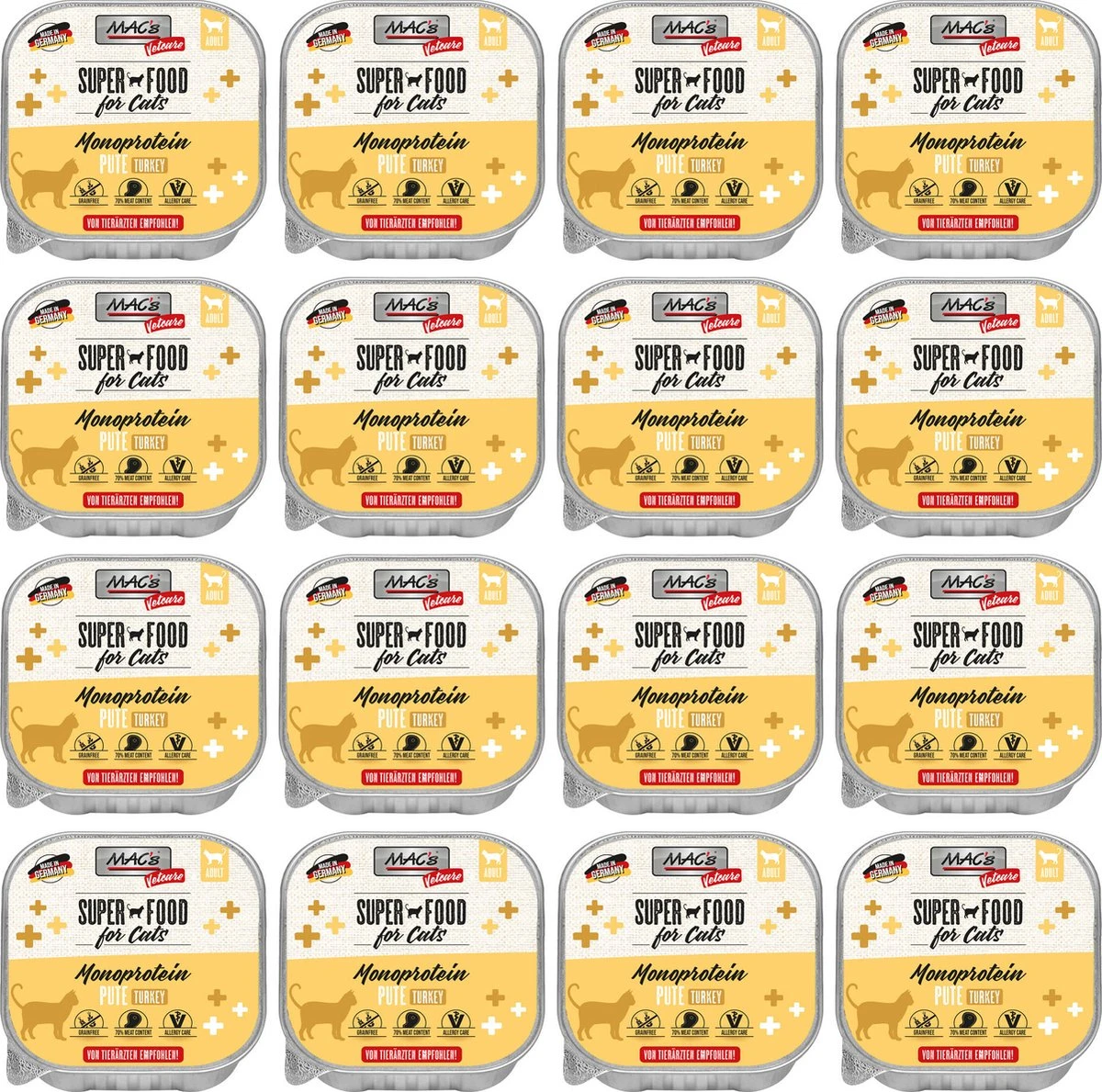 MAC’s Vetcare Mono Kalkoen is speciaal ontwikkeld voor de voedselgevoelige kat. Het kuipje bevat slechts één soort eiwitbron en is dus ideaal voor een uitsluitingsdieet. Met extra Taurine goed voor het hart, gezichtsvermogen en een mooie vacht.