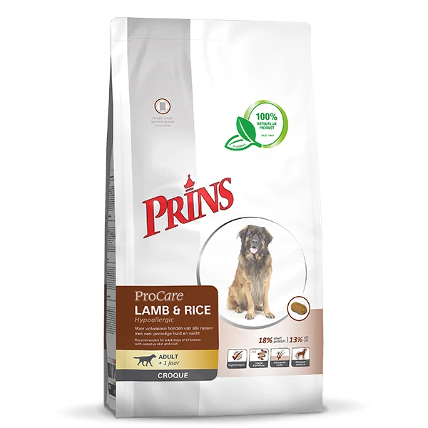 Voor honden met een gevoelige huid en maagdarmkanaal is het belangrijk dat ze de juiste voeding krijgen die ze goed kunnen verdragen. Prins ProCare Croque Lamb & Rice Hypoallergenic is een 100% natuurlijke, krokante brokvoeding voor volwassen honden met een gevoelige huid, vacht en spijsvertering.