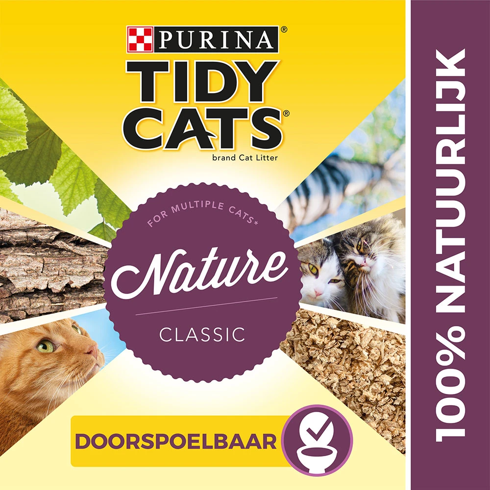 Katten houden van schoon. Dat geldt zeker voor hun kattenbak. Met Purina Tidy Cats Nature Classic geef je jouw kat 100% natuurlijke kattenbakvulling van houtvezels, die zorgt voor een optimale opbouw van klonten en geurcontrole. De milieuvriendelijke klonterende kattenbakvulling is enkel gemaakt van grondstoffen die uit duurzaam beheerde bossen komen. Bovendien is het volledig biologisch afbreekbaar en daarom kan de vulling gecomposteerd of door het toilet gespoeld worden. Dankzij het hoge absorbtievermogen ontstaan er vaste klonten die je gemakkelijk kunt opnemen, terwijl je de rest van de vulling laat liggen. Onaangename geurtjes hebben ook geen kans en worden betrouwbaar geabsorbeerd. Purina Tidy Cats Nature Classic in één oogopslag: Hoogwaardige kattenbakvulling Van 100% natuurlijke houtvezels Absorbeert vuil en geurtjes tot 7 keer van het eigen volume Klonterige vulling: maakt vaste klonten, gemakkelijke en besparende reiniging Milieuvriendelijk: grondstoffen uit duurzame bossen, 100% biologisch afbreekbaar, kan in het toilet of gecomposteerd worden. Weinig stof Laag eigengewicht: lichter dan gebruikelijke vulling, gemakkelijk te transporteren Gaat lang mee: tot 7 weken lang te gebruiken
