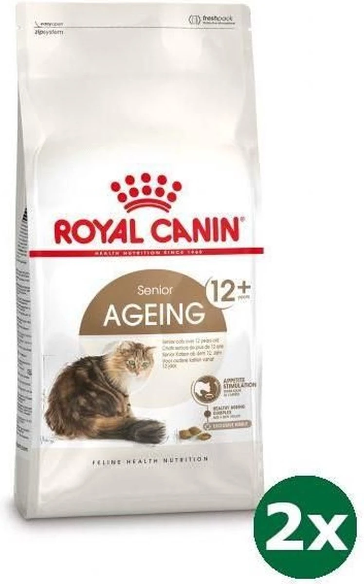 Royal Canin FHN Ageing 12+ 400GRRoyal Canin Ageing +12 bevordert het gezond oud worden van de kat dankzij een gepatenteerd complex van antioxidanten, EPA/DHA en tryptofaan, bekend om zijn kalmerende effecten.- Houdt de gezondheid van de nieren op peil, Ageing +12 bevat een aangepast fosfor gehalte. – Stimuleert de eetlust. Royal Canin FHN Ageing 12+ 400GR is volledige diervoeding voor katten.Samenstelling: isolaat van plantaardige eiwitten*, voorgekookt tarwemeel, dierlijke vetten, rijst, gedehydreerd gevogeltevlees, plantaardige vezels, hydrolysaat van dierlijke eiwitten, maïs, cichoreipulp, sojaolie, visolie, mineralen, psylliumschil en psylliumzaden, Fructo-Oligo-Sacchariden, hydrolysaat van gist (bron van Manno-Oligo-Sacchariden), hydrolysaat van schaaldieren (bron van glucosamine), bernagieolie, Tagetes (Afrikaan) extract (bron van luteïne), hydrolysaat van kraakbeen (bron van chondroïtine), tomaat