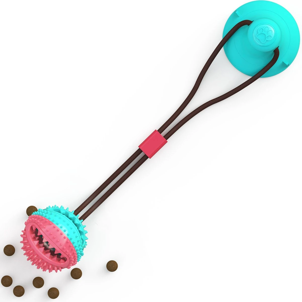 Je maakt de honden speelgoedbal makkelijk vast met de krachtige zuignap. Dit kauwspeelgoed voor honden kan eenvoudig worden bevestigd op elk glad oppervlak, zoals vloeren en kasten. De zuignap hecht het speelgoed aan de grond. Het elastische koord is bevestigd aan de bal zodat uw hond kan trekken aan de bal. Dankzij de zuignap en het schokabsorberende elastiek blijft de honden speelgoedbal lang vastzitten.