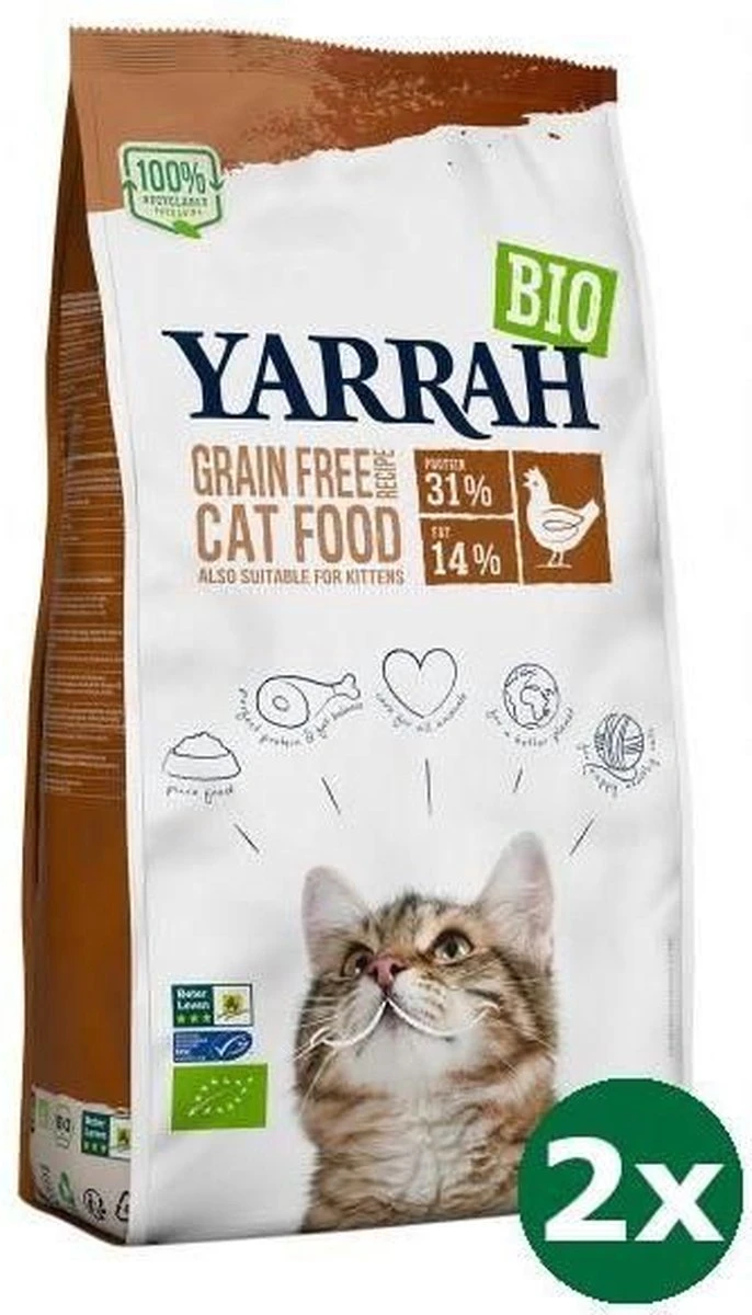 Yarrah Cat Sterilised Grain Free 700 gramMeer dan de helft van de huiskatten in Nederland is te dik; hierdoor stijgt de vraag naar speciaal graanvrij dieetvoer. Naast te weinig bewegen en te veel eten is een oorzaak van overgewicht na sterilisatie/castratie. Speciaal voor deze katten heeft Yarrah droogvoer ontwikkeld met een verlaagd vetpercentage. L-Carnitine is toegevoegd om de vetstofwisseling verder te optimaliseren. Het voer is uitermate geschikt om hongerige katten op een gezond gewicht te houden; het hoge vezelgehalte geeft de kat een goed verzadigd gevoel. Yarrah Cat Sterilised Grain Free is volledige diervoeding.- Speciaal ontwikkeld voor gecastreerde en gesteriliseerde katten- Met verlaagd vetpercentage om overgewicht te voorkomen- Het hoge vezelgehalte geeft de kat een verzadigd gevoelSamenstelling: gedroogde kip* (18%), tapioca*, groene erwten*, gele erwten*, sojabonen*, aardappeleiwit*, zonneblo